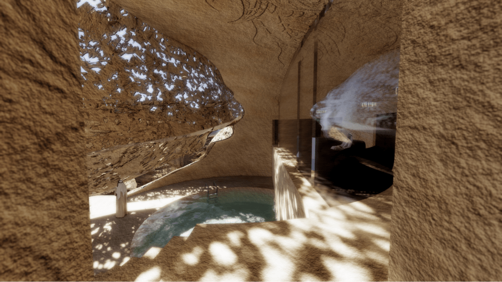 “In contrast to the curvilinear forms of our nearby Sacred Reef Resort, this inland project engages with the majestic granite mountains and the mythical desert landscape. We work with the language of the earth and have created new spaces and experiences – buildings that disappear into the tectonic landscape and evoke ancient Nabataean civilisations.”