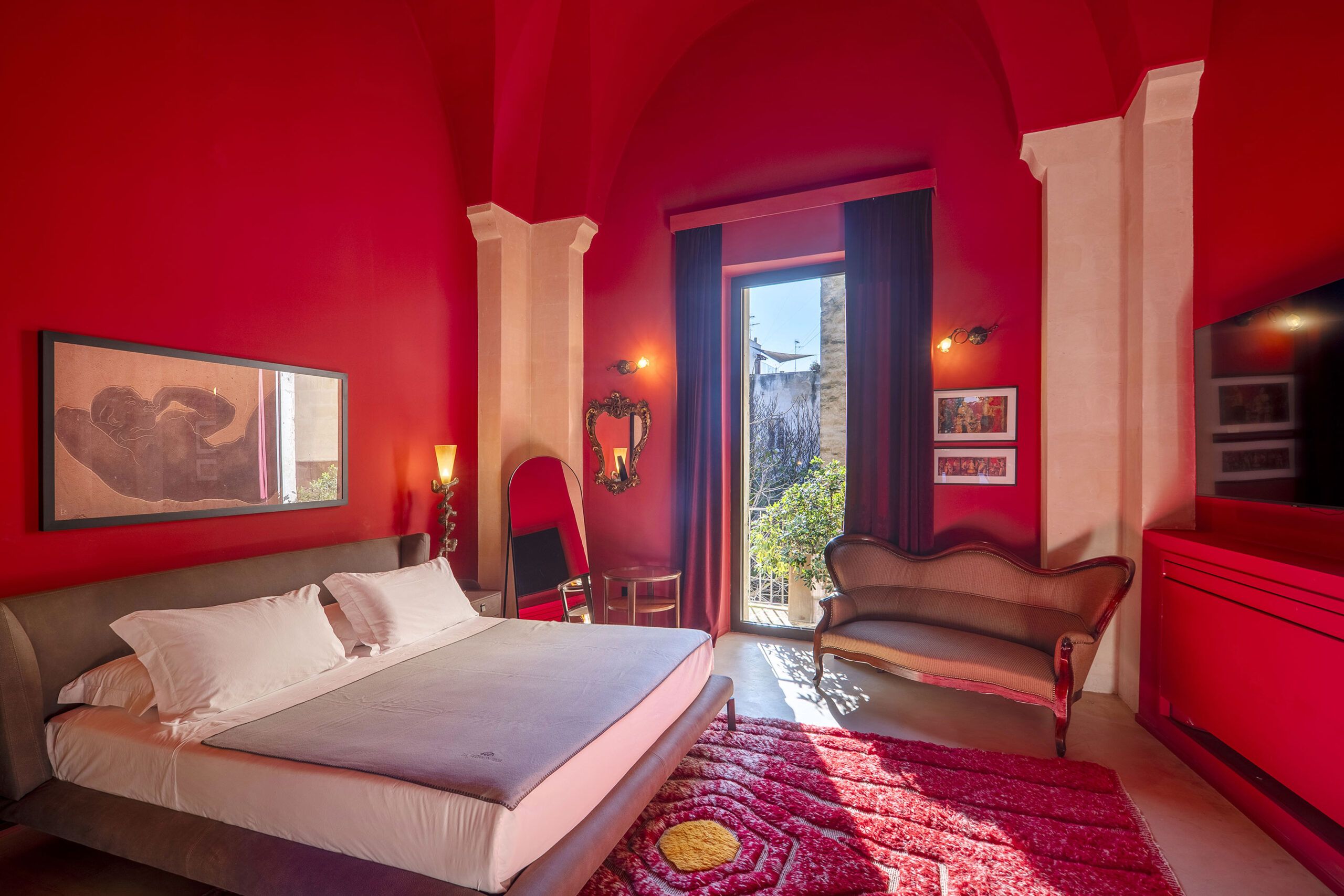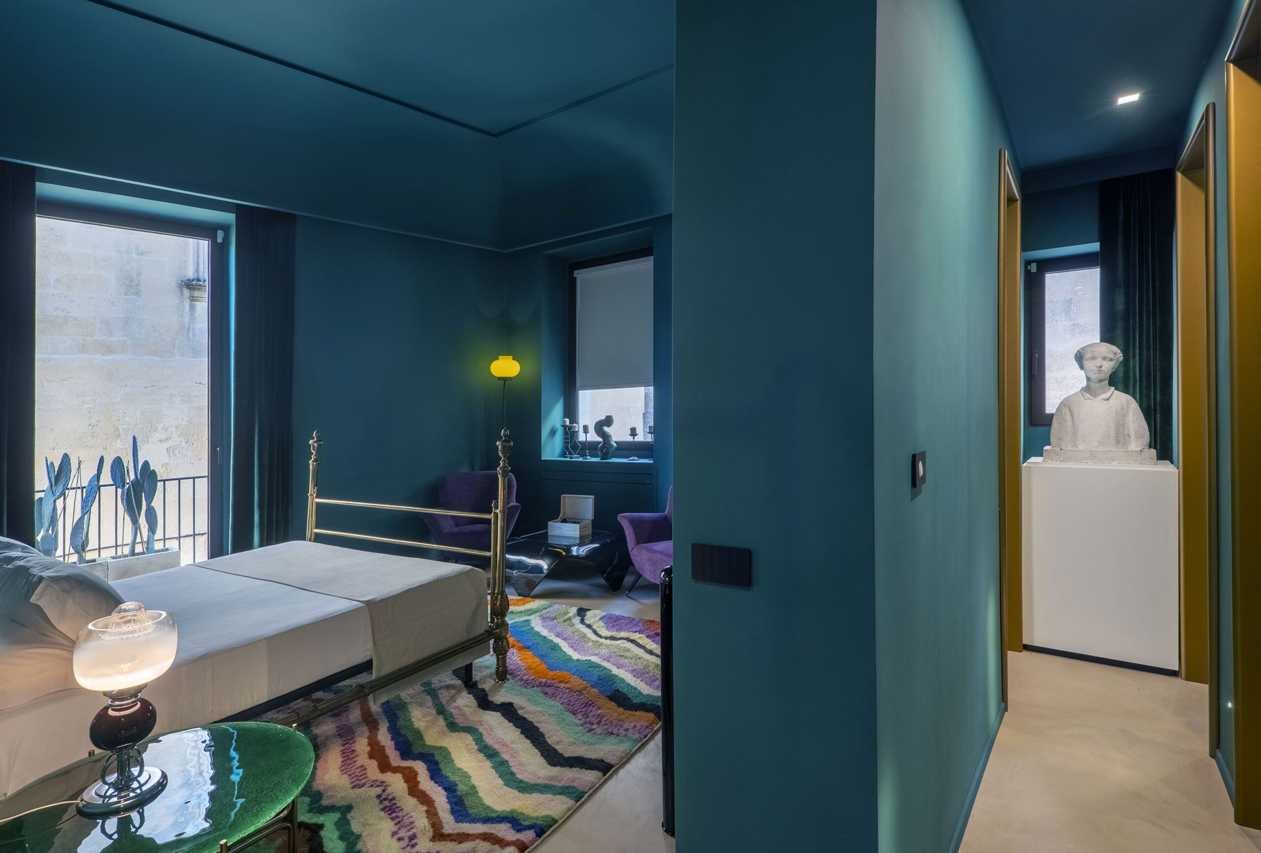At the Fiermonte Museum in Lecce, history refuses to remain behind glass. Suite Marbre envelops guests in pistachio-green serenity—a color choice inspired by the sculptors’ materials, where framed figure studies by Letourneur and Zwobada observe from sage walls, a monumental white marble torso stands sentinel, and geometric floor tiles echo 1930s Parisian ateliers. Caned armchairs and swan-neck table lamps conjure the era when Antonia moved between two men, two houses, two artistic visions. The suite opens to a private terrace overlooking the secret garden where century-old sculptures rest among medlars and araucarias—the same dialogue between stone and nature that once unfolded in Fontenay-aux-Roses. Suite Avant-Garde plunges into midnight teal drama, walls and ceiling saturated in color that recalls “Obsession,” one chapter in this ménage-à-trois narrative. A brass bed frames white linens against the theatrical backdrop, while a rainbow-hued rug references the emotional spectrum of 1,001 love letters Zwobada wrote to Antonia. A classical bust in golden-lit niche reminds visitors they’re sleeping inside art history. Then the museum itself: pristine white galleries where pedestals illuminate portrait busts—Antonia, René, Jacques—their faces frozen in stone yet animated by the story swirling around them. Pendant lights sheathed in vintage photographs hang like memories suspended in air. Historic tile patterns guide visitors through rooms named “Love at First Sight,” “Reconciliation,” “The Leap Across the Garden.” Here’s the revolutionary concept: at night, when museum doors close to the public, suite guests wander these galleries alone with flashlights, encountering La Verticale—Zwobada’s sculpture of yearning reaching skyward—in meditative silence. This is the Fiermonte vision: not preservation but participation, not exhibition but immersion. Antonia’s emancipation from muse to sovereign artist, her radical choice that shattered friendship yet created enduring beauty, becomes a space you inhabit. Each suite—whether serene green Marbre or moody teal Avant-Garde—serves as chapter in a love story you don’t just read but live within. “The Heart of Time” beats here, proving that great passion doesn’t fossilize in the past but transforms into rooms where we sleep, wake, and briefly become part of someone else’s immortal narrative. | Photo: Bruno Barillari
