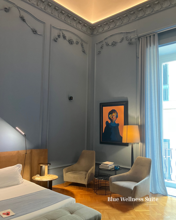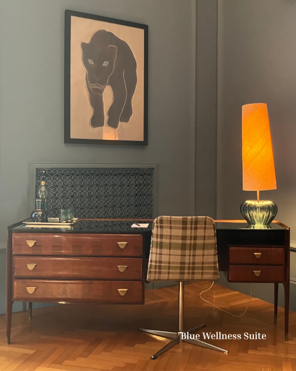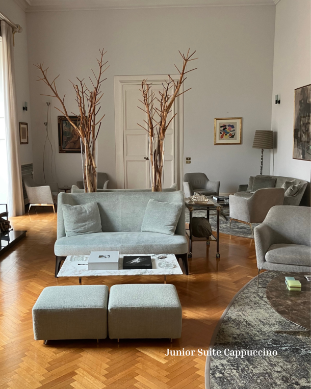 Thus everything in La Fiermontina Palazzo Bozzi Corso comes together into a greater whole. Each of the ten suites, whether dedicated to glamorous Lady Astor or the sculptors Letourneur and Zwoboda, is a thread in a rich fabric that continues to be woven. High ceilings and doors with original fittings define the rooms. The furnishings and interior architecture are classic to design according to the period’s thematic style, with important pieces by Sottsass, Gio Ponti, Mackintosh, and Le Corbusier.