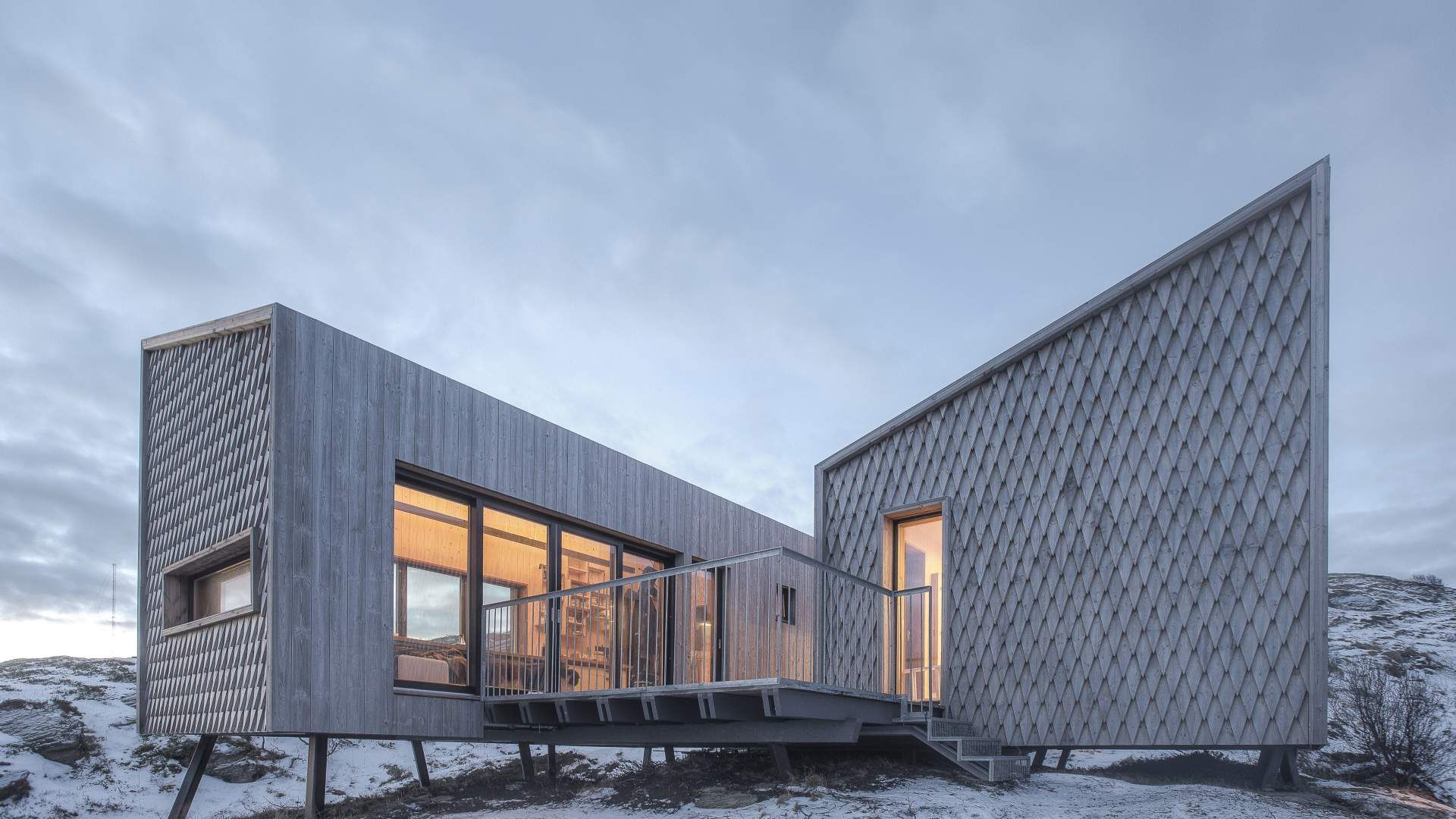 The thirteen buildings are all monofunctional. One building serves for sleeping, another houses the kitchens, yet another is for working. The architectural imperative reads: Go outside. Above certain building sizes, Norwegian building regulations require ventilation systems. The solution was division: Each function gets its own building, the structures remain small, and the air remains real. What began as a pragmatic solution became philosophy. Whoever goes from the sleeping cabin to the kitchen walks through the night. At three in the morning, when the bladder presses, you suddenly stand under dancing northern lights. The buildings stand on angled steel pillars drilled into the rock. They are clad with Kebony wood, which ages silver-gray through the salt water and wind.